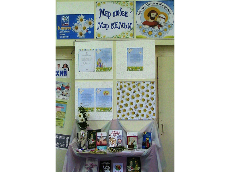 К празднику также оформили книжную выставку-рассказ «Мир любви, мир семьи», на которой представлена литература о жизни православных святых Петра и Февронии Муромских и книги по семейному воспитанию.