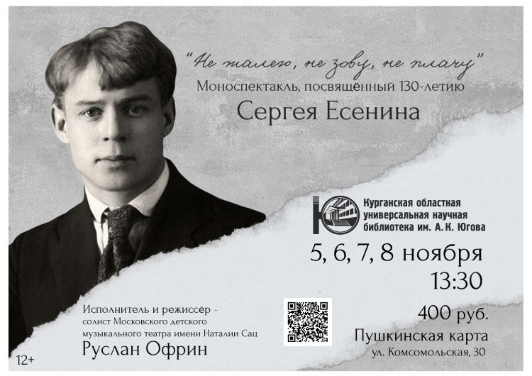 Библиотека имени А. К. Югова приглашает на премьеру моноспектакля «Не жалею, не зову, не плачу», посвященного 130-летию со дня рождения великого русского поэта Сергея Александровича Есенина.