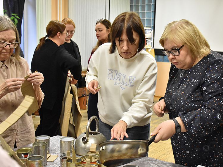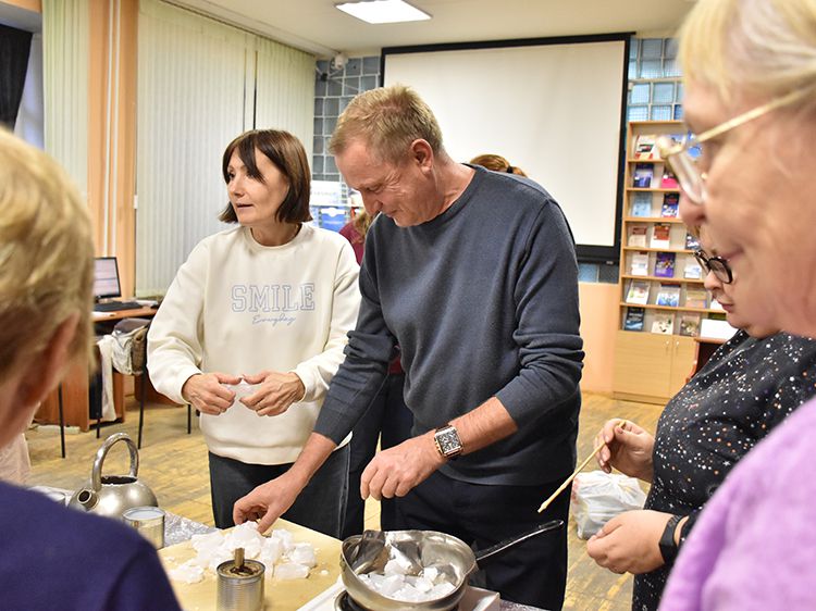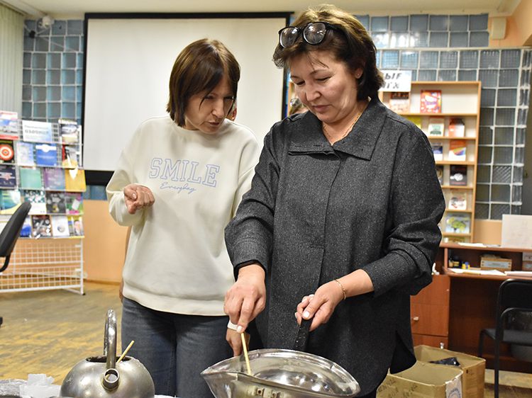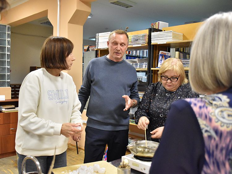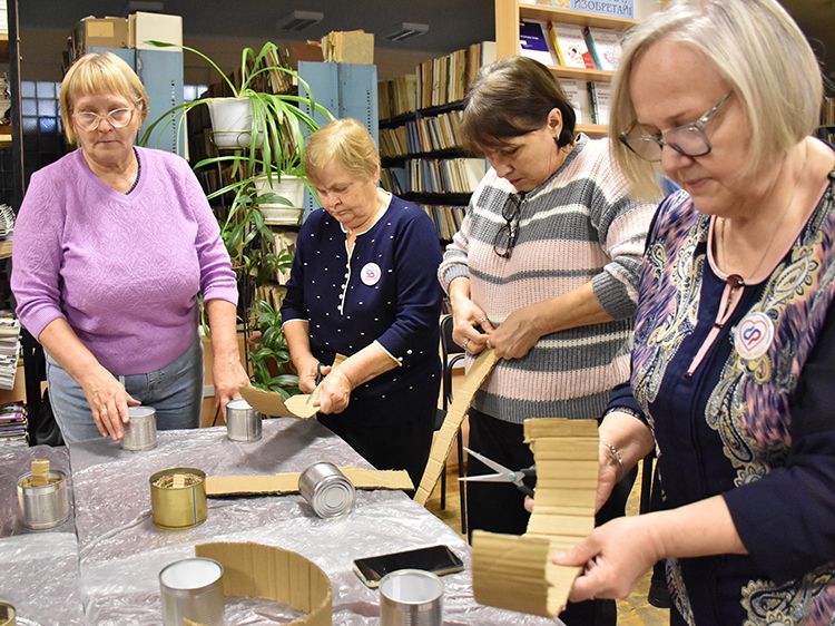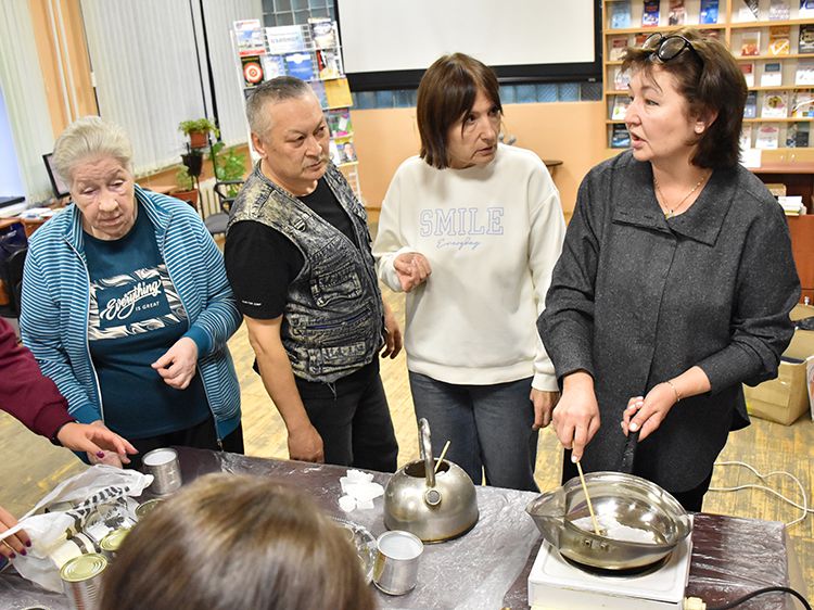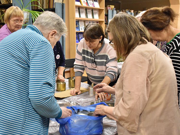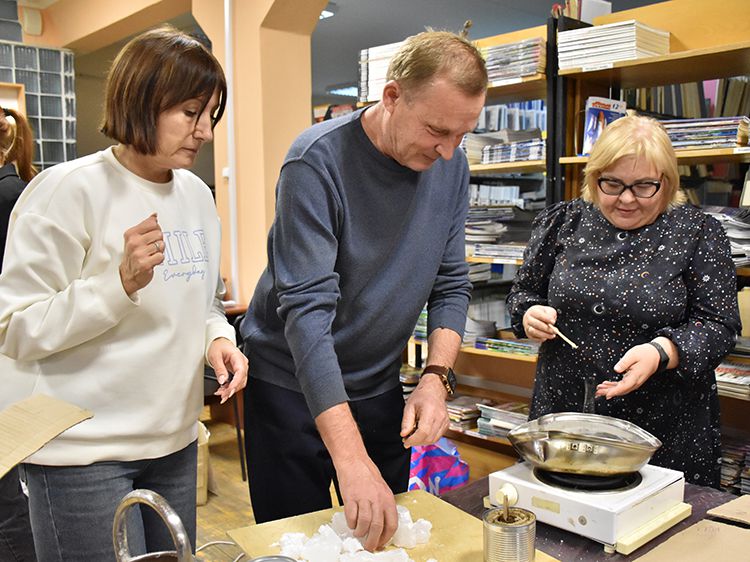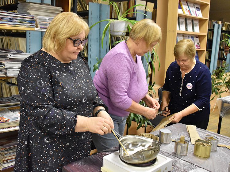 Сотрудники отделения Социального фонда России по Курганской области и волонтёры Центра общения старшего поколения г. Кургана пришли в библиотеку имени А. К. Югова для того, чтобы научиться изготовлению блиндажных свечей и своими руками сделать партию для отправки нашим ребятам в зону СВО.