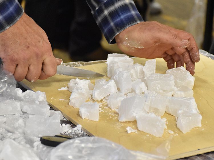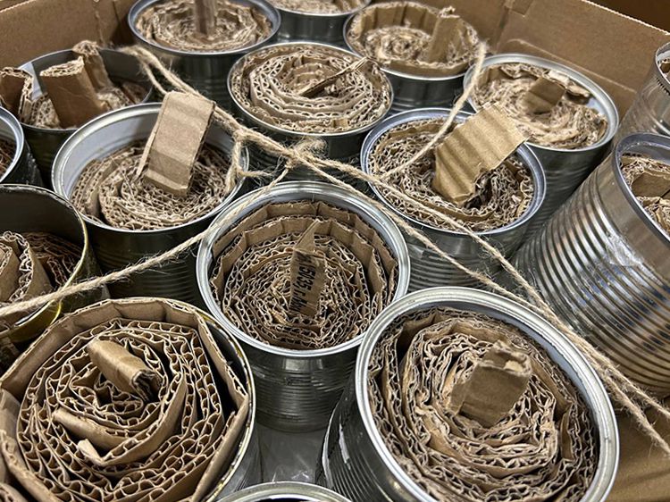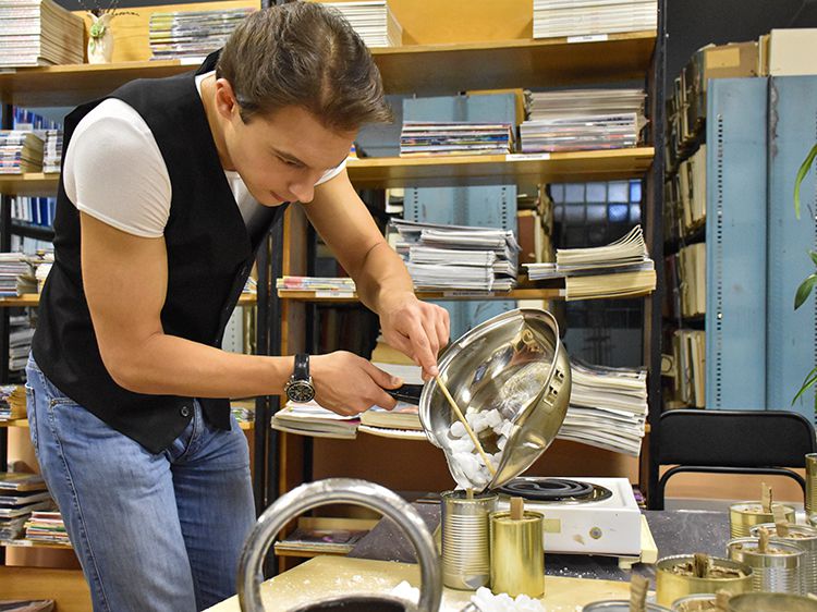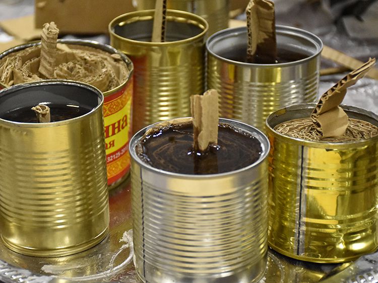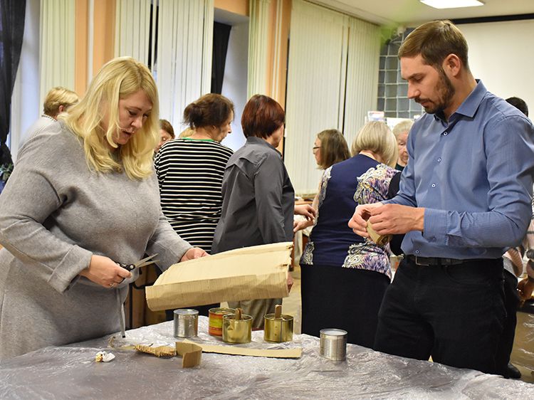 После подробного инструктажа работа закипела. Волонтёры предпочли вариант разделения труда – так практичнее и быстрее. Одни нарезают картон, другие определённым способом его сворачивают, третьи работают с воском…