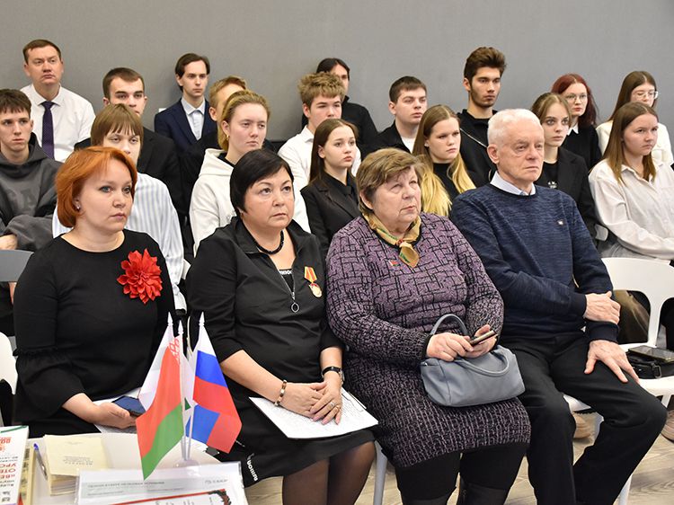 Участники встречи провели разговор на тему «История в бронзе и камне». Библиотекарь, куратор проекта «Россия – Беларусь. Творческие встречи «Дорогами Победы»» Вера Забирко рассказала об образовании Курганской области, о присвоении городу наград «…за значительный вклад жителей города в достижение Победы в Великой Отечественной войне 1941–1945 годов»: Ордена Трудового Красного Знамени (1982 г.) и почётного звания «Город трудовой доблести» (2025 г.). Она напомнила и о проведении в библиотеке Всероссийской научно-практической конференции «Великая Отечественная война: уроки истории», в которой приняли участие представители республики Беларусь. Вера Забирко рассказала и о сайте «Память Зауралья», с которым работают специалисты библиотеки, где помогают найти сведения о погибших земляках.