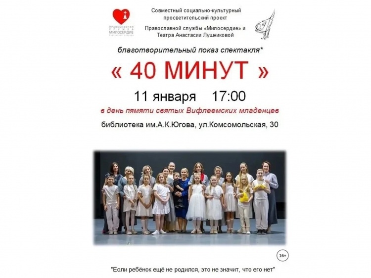 Показ спектакля «40 минут» пройдёт 11 января, в 17:00, в концертном зале библиотеки имени А. К. Югова. Показ посвящён дню памяти святых Вифлеемских младенцев. Русская православная церковь чтит память младенцев 11 января (по новому стилю).