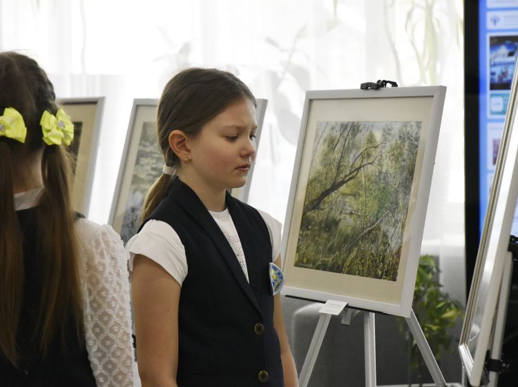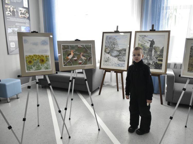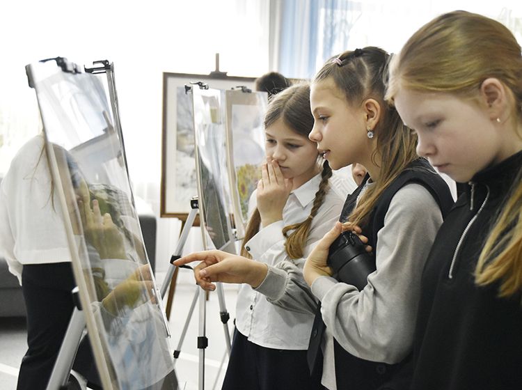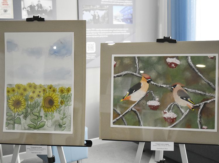 На картинах девочки – знакомые и добрые сюжеты: осенняя дорожка в школьном дворе, поле ярко-жёлтых подсолнухов, пушистые свиристели на ветке рябины. Работы выполнены акварельные красками и гуашью.