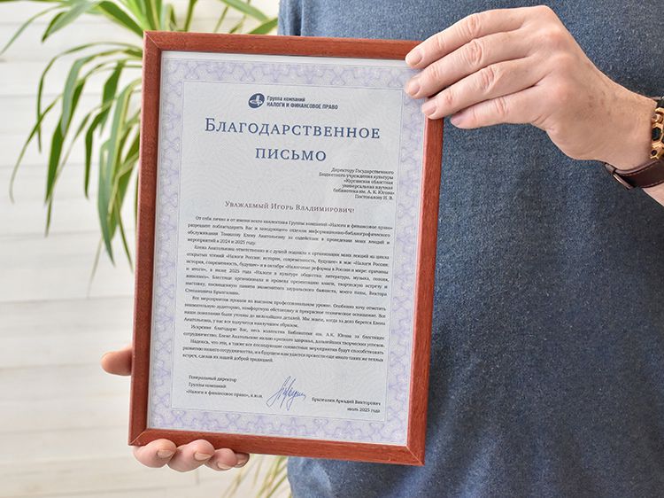 На встрече не обошлось и без подарков. Аркадий Брызгалин от имени всего коллектива Группы компаний «Налоги и финансовое право» вручил Благодарственное письмо директору библиотеки Игорю Постовалову, в котором выразил благодарность руководителю и коллективу библиотеки за содействие в проведении мероприятий по финансовой грамотности.