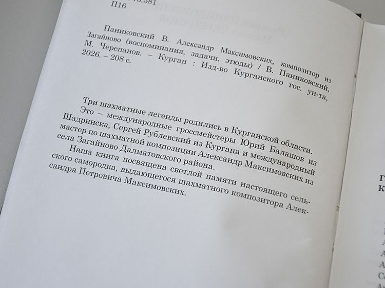Новая книга Валерия Паниковского и Михаила Черепанова «Александр Максимовских, композитор из Загайоново» – дань уважения талантливому человеку, выдающемуся шахматному композитору, настоящему сельскому самородку Александру Петровичу Максимовских. Мастер спорта СССР, мастер ФИДЕ, двукратный чемпион России по составлению этюдов, трёхкратный чемпион мира в составе сборной команды СССР, он оставил яркий след в мире шахмат.