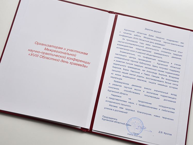 Коллективу Юговки и всем участникам конференции поступила Благодарность и от Председателя Курганской областной Думы Дмитрия Фролова. Приветственный адрес вручили директору библиотеки Игорю Постовалову во время пленарного заседания. «За прошедшие годы вами накоплен значительный опыт научно-исследовательской деятельности, сложились традиции взаимодействия представителей краеведческого движения, исторических школ и широкой общественности. Знаменательно, что конференция проводится в стенах настоящего центра просвещения – Курганской областной универсальной научной библиотеке. Здесь получают поддержку и развитие лучшие традиции, заложенные такими подвижниками зауральского краеведения, как Александр Зырянов, Владимир Бирюков, Борис Карсонов и Павел Свищёв. Вы возрождаете прошлое нашей малой родины, восстанавливаете белые пятна из жизни выдающихся земляков, пишите семейную историю зауральцев. Краеведческое движение внесло значительный вклад в развитие научной мысли и воспитание подрастающего поколения, способствовало популяризации достижений Курганской области», – говорится в Приветственном адресе.