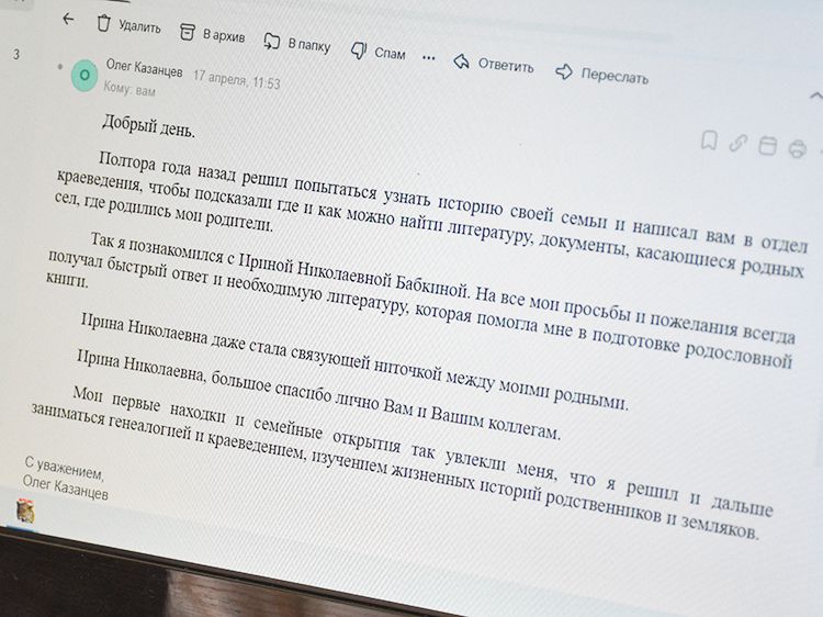 «Полтора года назад решил попытаться узнать историю своей семьи и написал в отдел краеведения, чтобы подсказали, где и как можно найти литературу, документы, касающиеся родных сёл, где родились мои родители. Так я познакомился с сотрудниками отдела краеведения. На все мои просьбы и пожелания всегда получал быстрый ответ и необходимую литературу, которая помогла мне в подготовке родословной книги. Сотрудничество стало связующей ниточкой между моими родными.