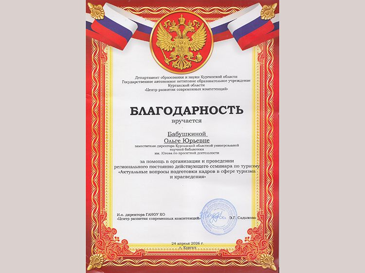 Заместитель директора Областной библиотеки имени А. К. Югова Ольга Бабушкина выступила спикером на семинаре «Актуальные вопросы подготовки туристских кадров в сфере туризма и краеведения» в Региональном модельном центре дополнительного образования детей в Курганской области.